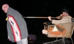 Endgame and Waiting for Godot. A is a blind street corner fiddler looking for spare change. B is an invalid in a wheelchair looking for company. Will it be love or violence between them, or both?